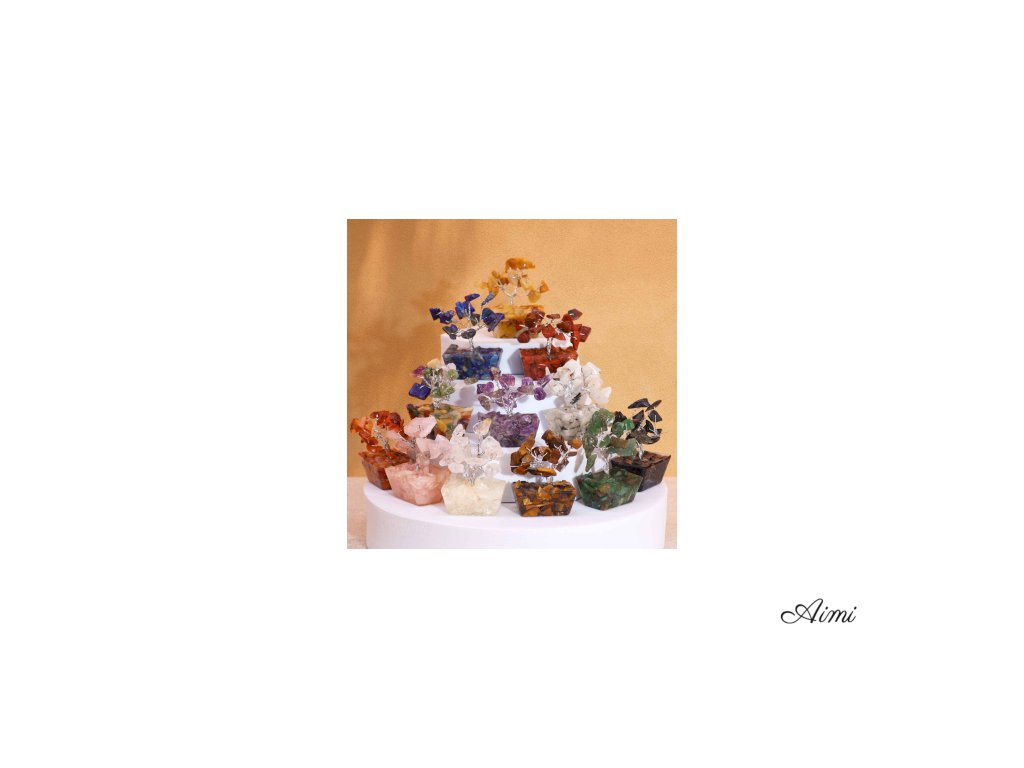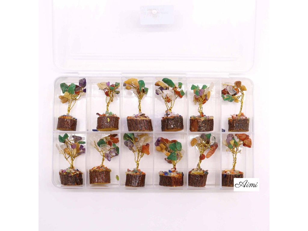 MGemT-11 - 12x Mini Stromčeky z Drahých Kameňov na Drevenej Základni - Rozne Kamene (15 kameňov)
