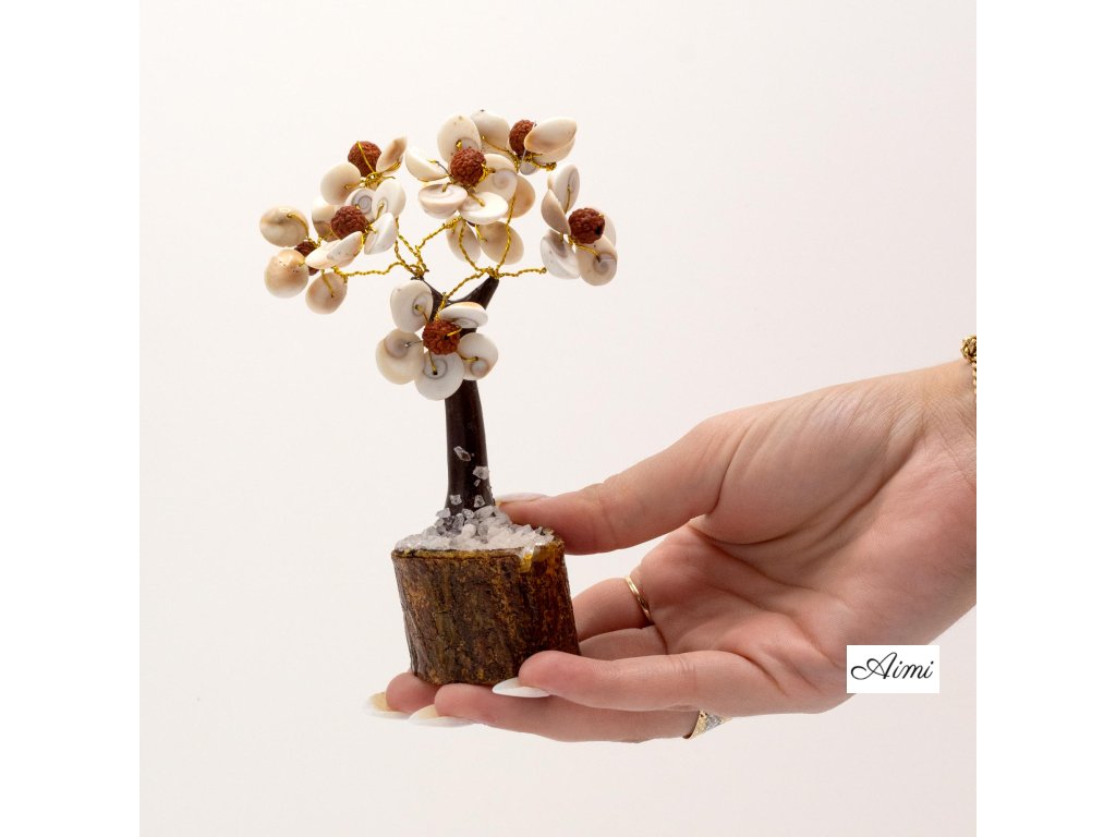 Tento jedinečný stromček kombinuje mystickú silu 45 kameňov Gomati Čakra s posvätnými korálkami Rudraksha, ktoré sú uctievané pre ich duchovné liečivé vlastnosti. Spolu vytvárajú silný symbol ochrany, rastu a rovnováhy.