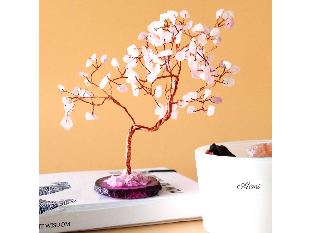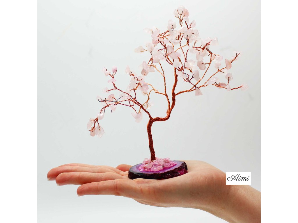 So základňou z ružového achátu a 100 kameňmi Ruženínu, vyžaruje tento veľký stromček lásku, súcit a harmonický život a vytvára ohromujúci ústredný bod. Vetvy týchto stromov sú vyrobené z ohybného kovového drôtu, takže si ich zákazníci môžu upraviť podľa seba a vytvoriť tak dynamický a jedinečný displej.