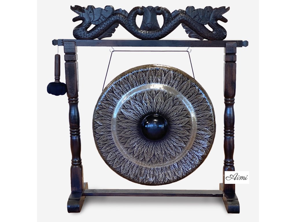Veľký Gong s Hnedým Antickým Stojanom - 80cm - Čierny - Vzorovaný