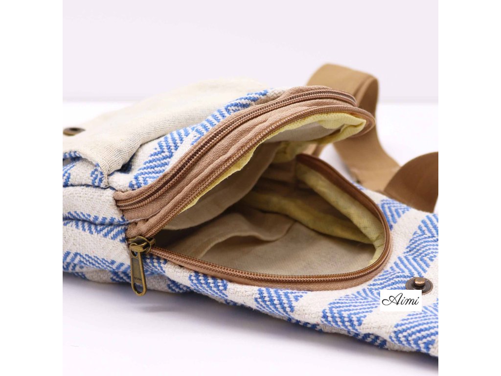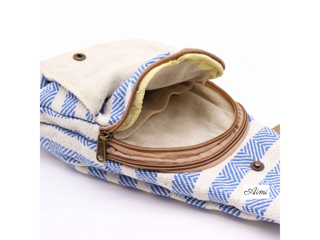 Táto všestranná crossbody taška vyrobená z prírodnej bavlny v nadčasovej modrej a bielej farbe kombinuje ekologické materiály s nenáročným štýlom.