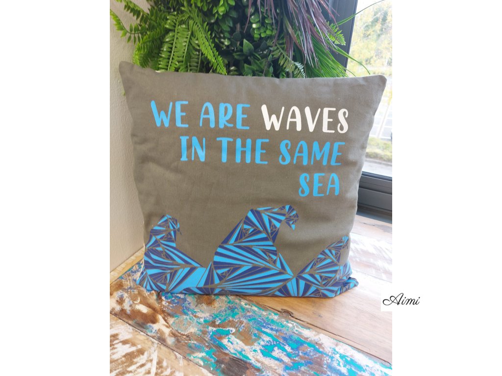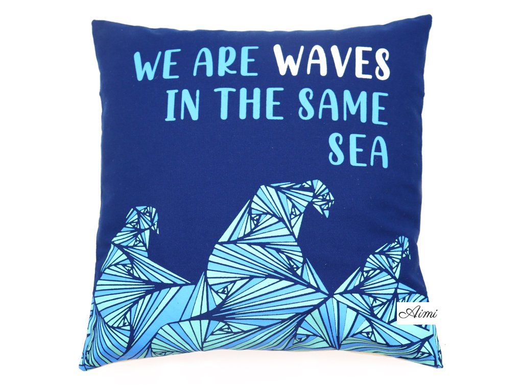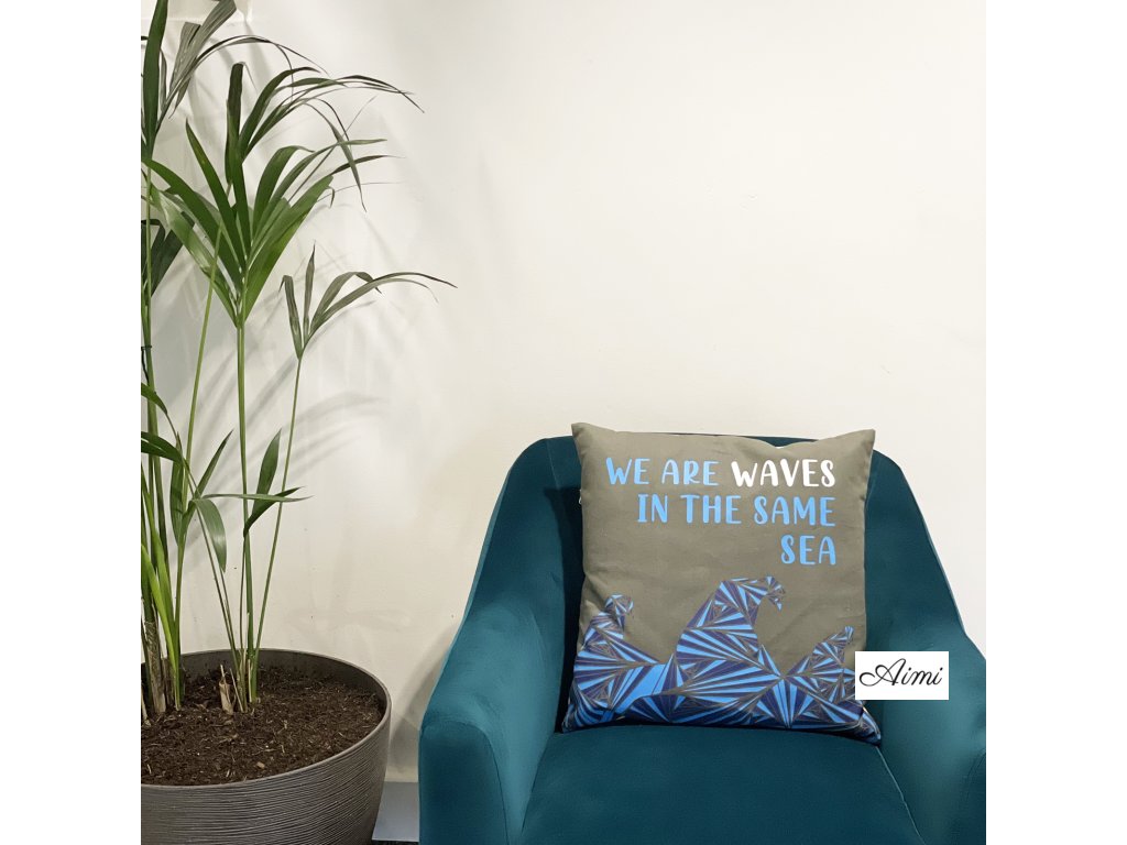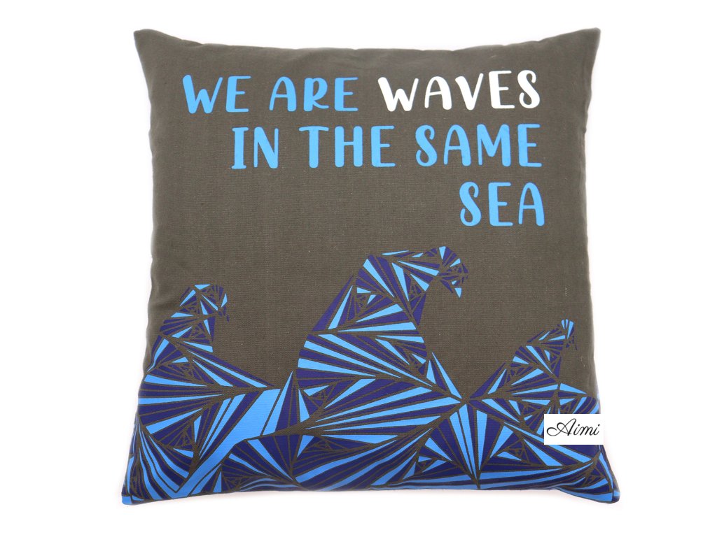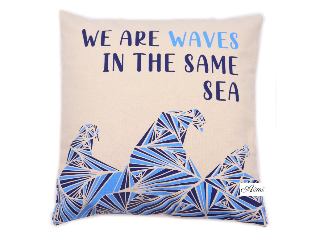 Bavlnená Obliečka na Vankúš s Potlačou - We are Waves - Sivá, Modrá a Prírodná