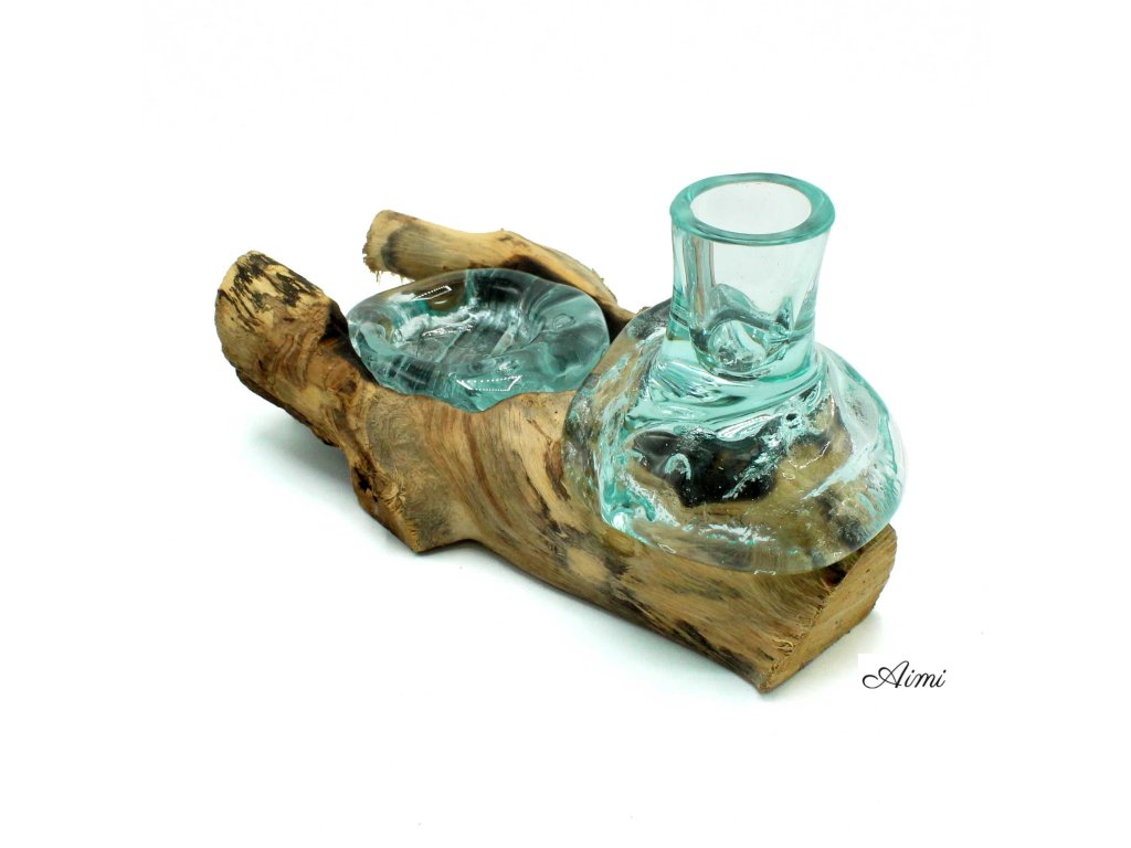 Roztavené Sklo na Dreve - Malá Kvetinová Váza a Svietnik na Čajovú Sviečku