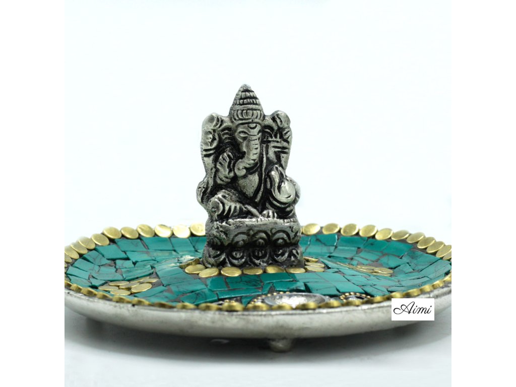 Začnite každú cestu s tibetským dekoračným stojanom na vonné tyčinky a kužele Ganesh. Ganesh, odstraňovač prekážok, sa dostáva do centra pozornosti v tomto nádherne spracovanom stojane, ktorý sľubuje nové začiatky a jasné cesty. Zložitá mozaika s upokojujúcou tyrkysovou farbou spolu so striebornými a zlatými detailmi robí z každého kusu ohromujúcu poctu božstvu múdrosti.