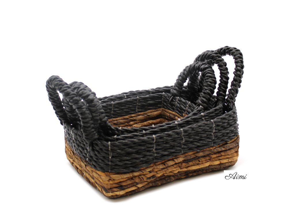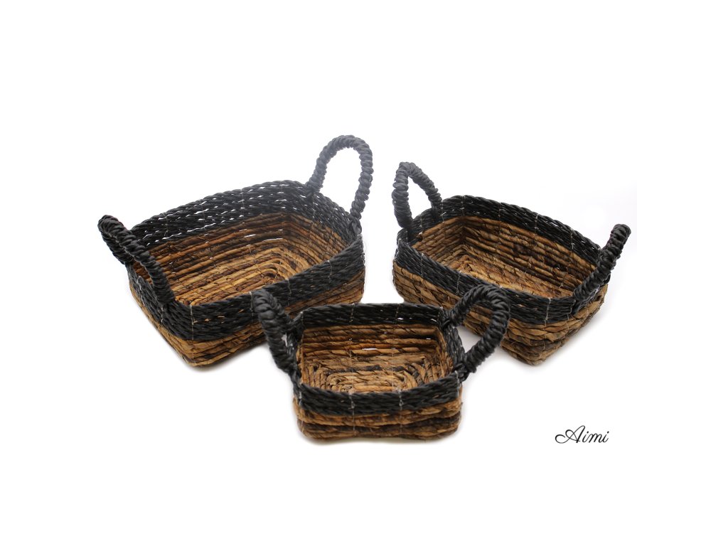 Štvorcový Košík z Banánového Listu a Čiernej Raffie - Súprava 3 kusov