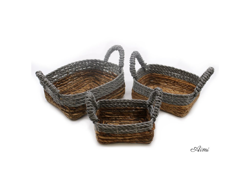 Štvorcový Košík z Banánového Listu a Šedej Raffie - Súprava 3 kusov