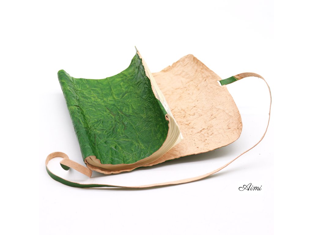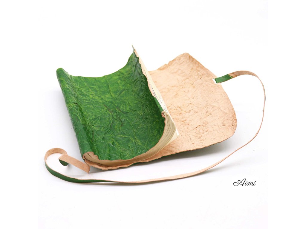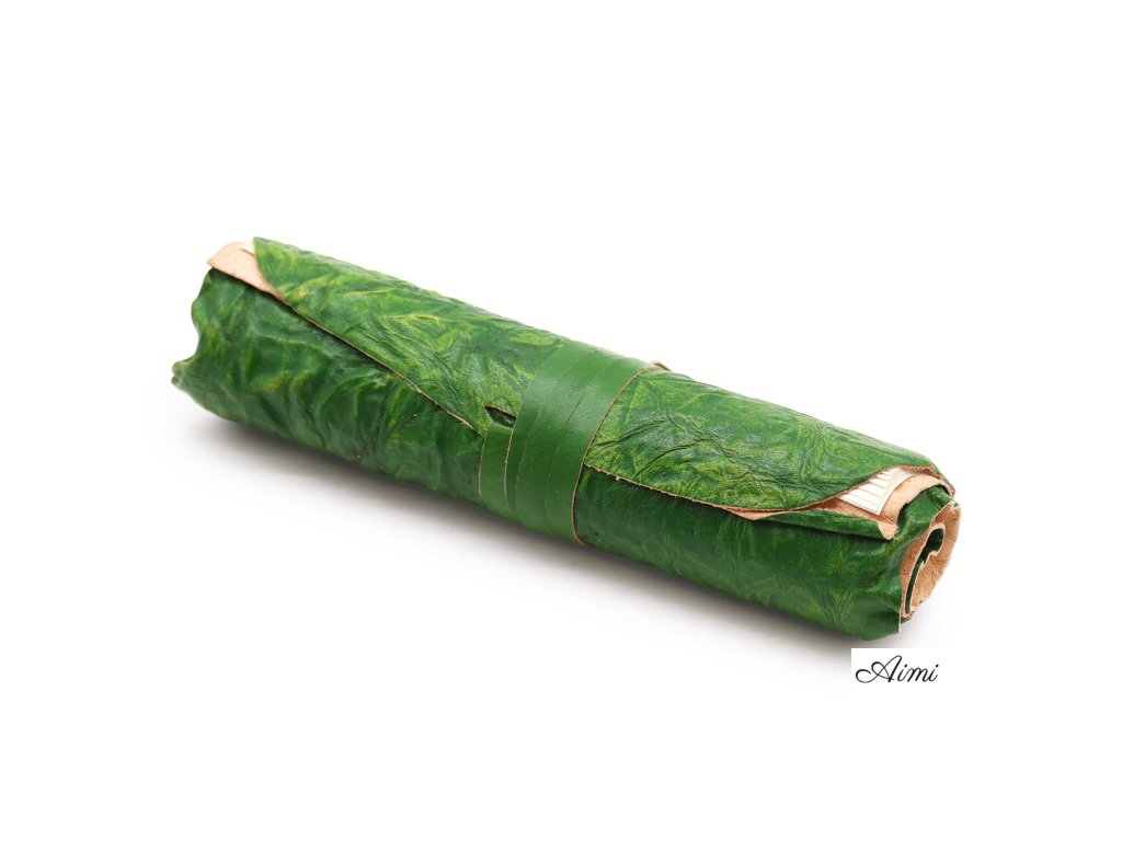 Cestovný zápisník v rolovanej koži v podmanivom odtieni Zelenej farby.