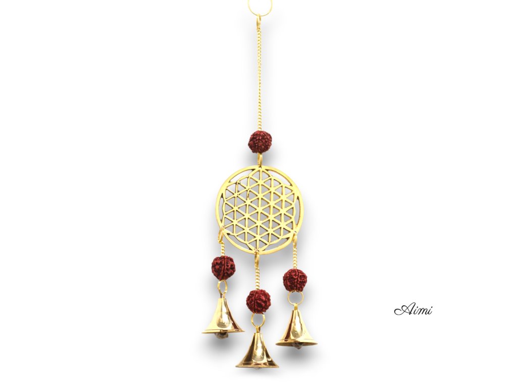 Indická Zvonkohra - Mosadzný Kvet Života s Korálkami Rudraksha - 3 Zvončeky - 6x27cm