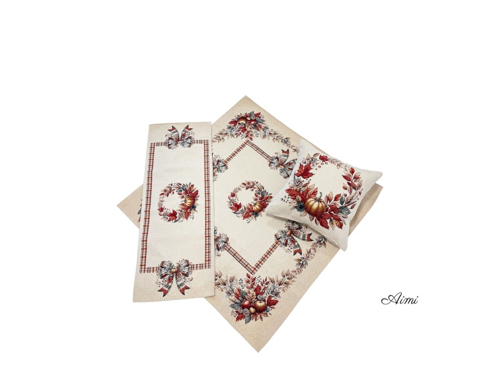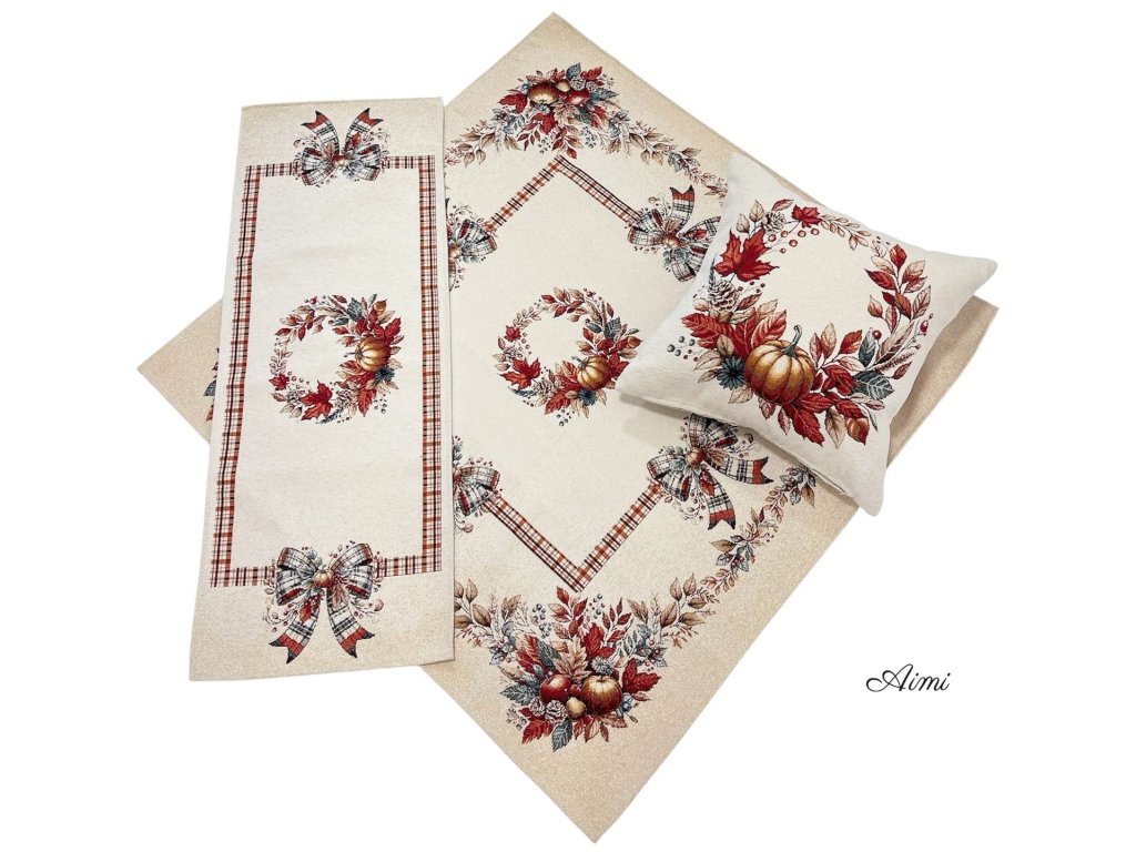 Krásny gobelínový obrus s motívom TEKVIČIEK A LISTOV. Vyskladajte si svoju sadu z tejto krásnej Gobelínovej súpravy, ktorá pekne dotvorí Váš interiér. Jednotlivé rozmery alebo obliečku si vyberte z dostupných variantov. Gobelínové obrusy sa vyznačujú svojou dlhou životnosťou a kvalitným prevedením.