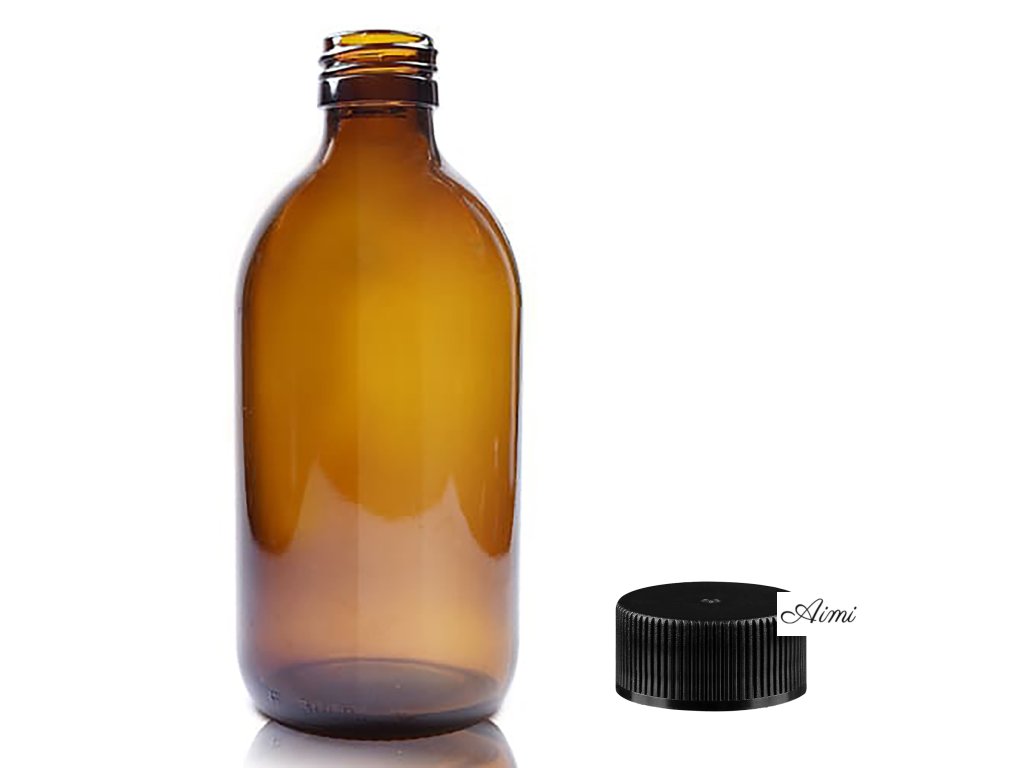 300 ml Jantárová Sklenená Fľaša s Čiernym Plastovým Uzáverom