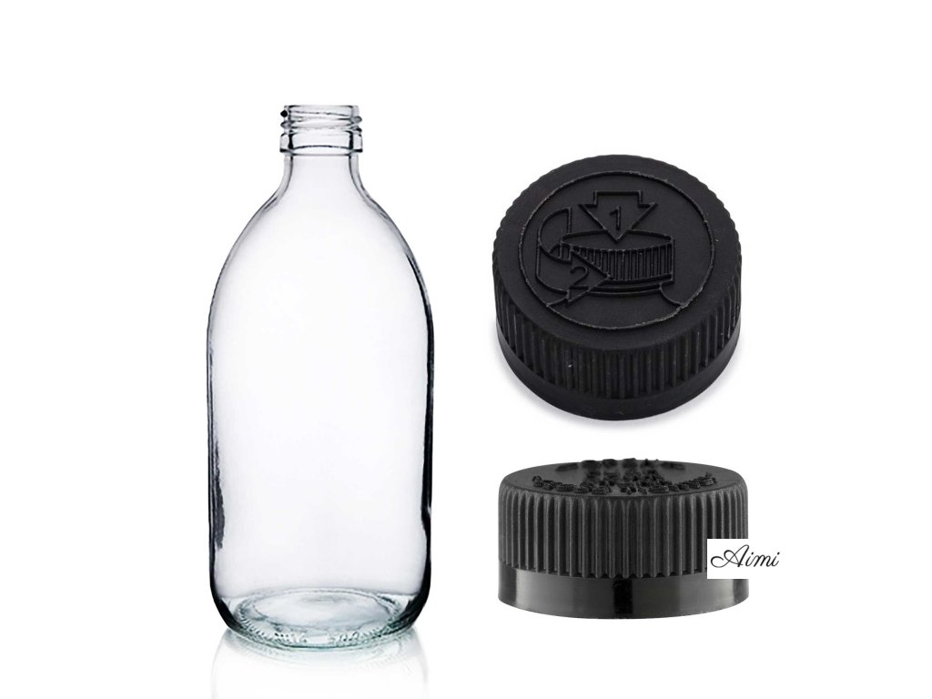 300ml Lieková Fľaška z Číreho Skla s Čiernym Uzáverom