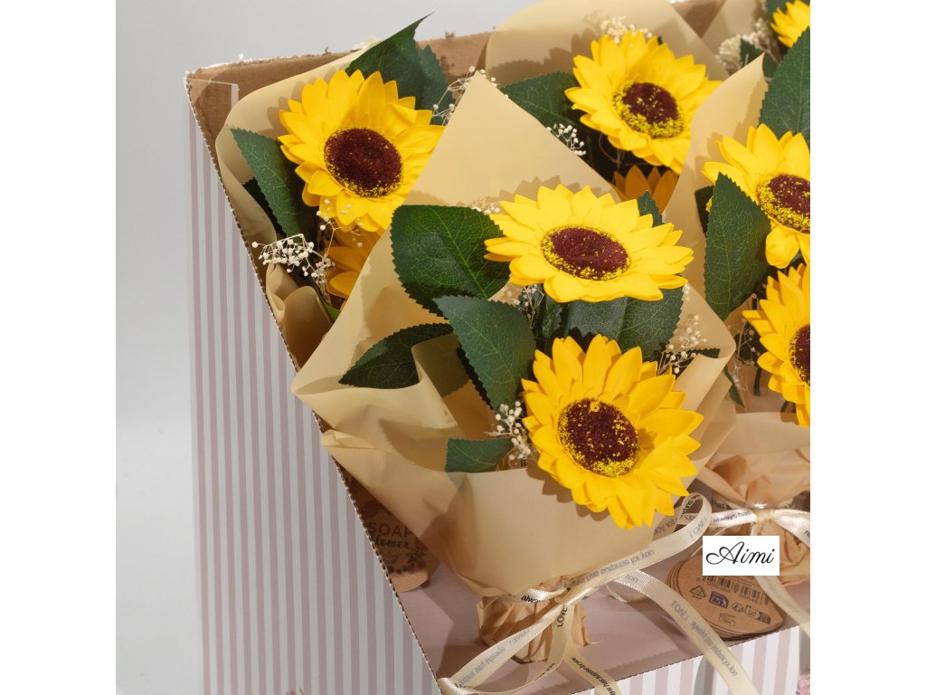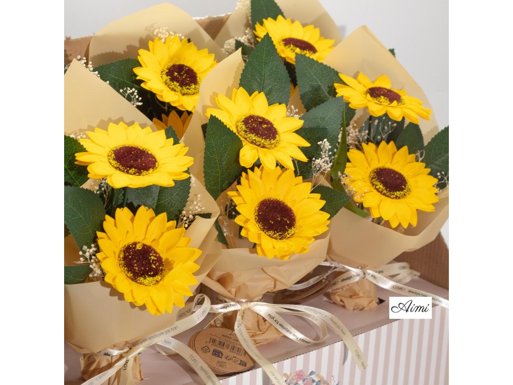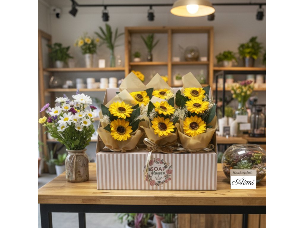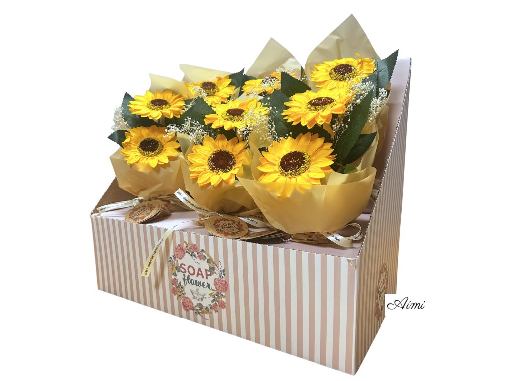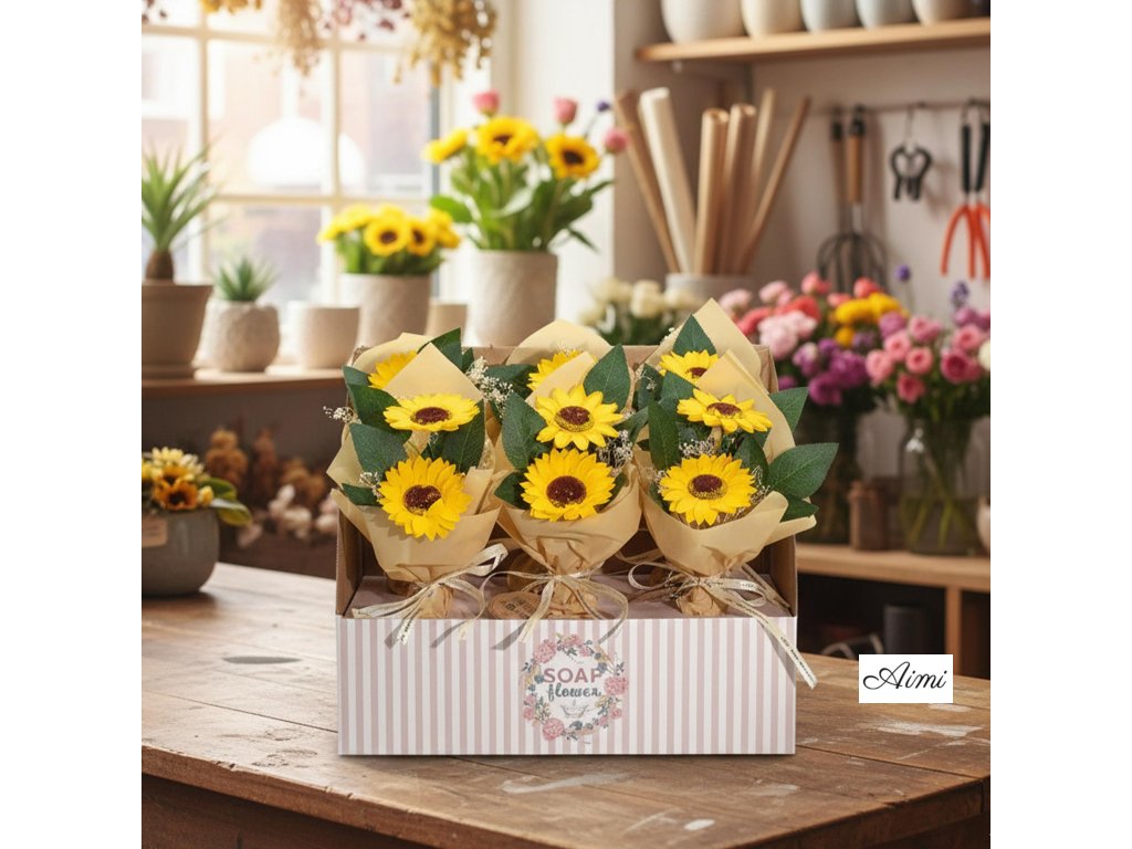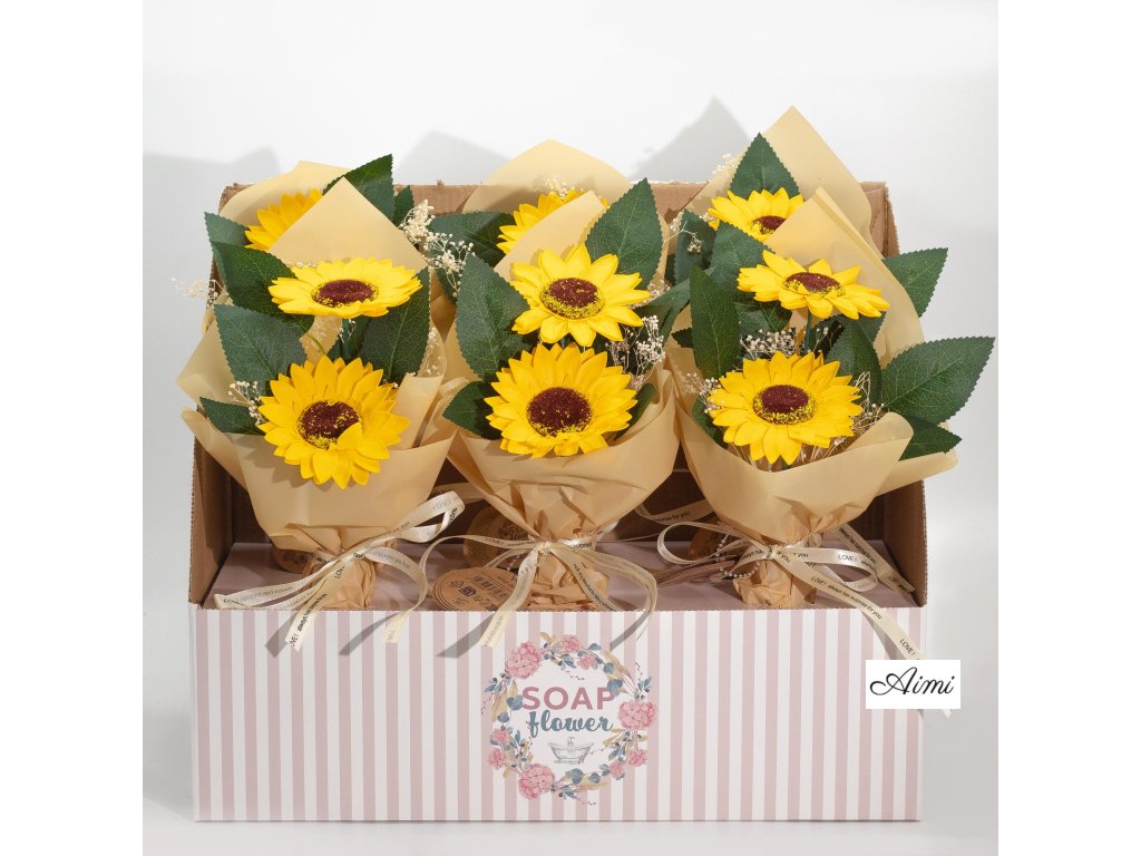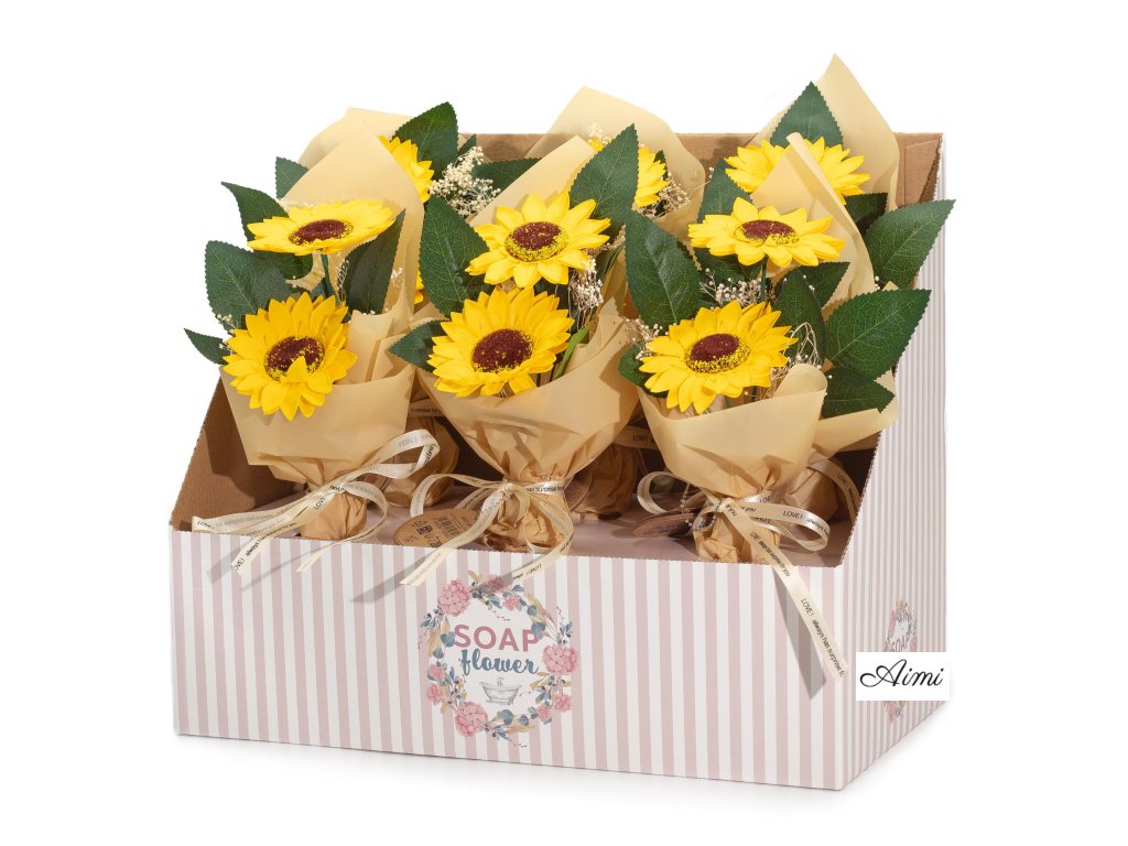 Každé balenie obsahuje šesť nádherných mydlových kytíc, z ktorých každá pozostáva z dvoch ručne vytvorených slnečníc, starostlivo naaranžovaných a zabalených – pripravených na predaj priamo z krabice.