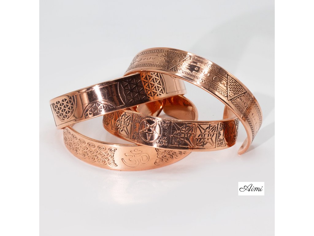 Tieto náramky z čistej medi sú ručne vyrábané v Indii a zdobené duchovnými a dekoratívnymi vzormi na vonkajšej strane – medzi nimi symbol Óm, posvätná geometria, hviezdy, vlny či motívy listov.