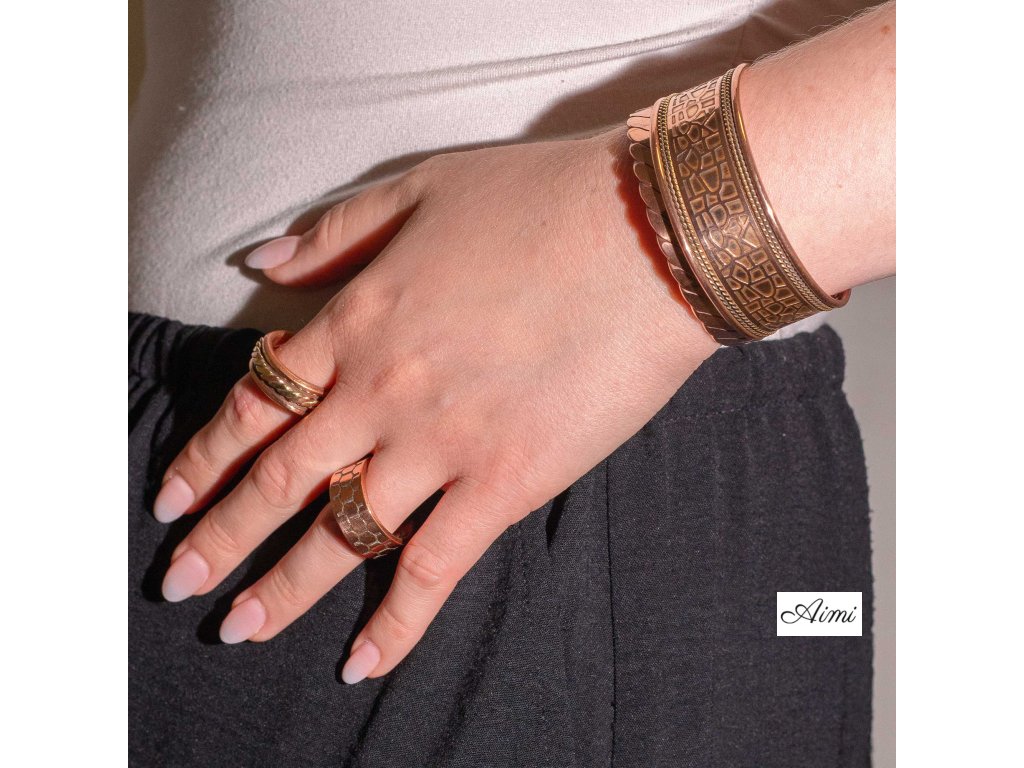 Bohaté tóny medi v kombinácii so zlatistou mosadzou vytvárajú náramky, ktoré okamžite zaujmú. Otvorený manžetový dizajn umožňuje jednoduché prispôsobenie veľkosti a pohodlné nosenie.