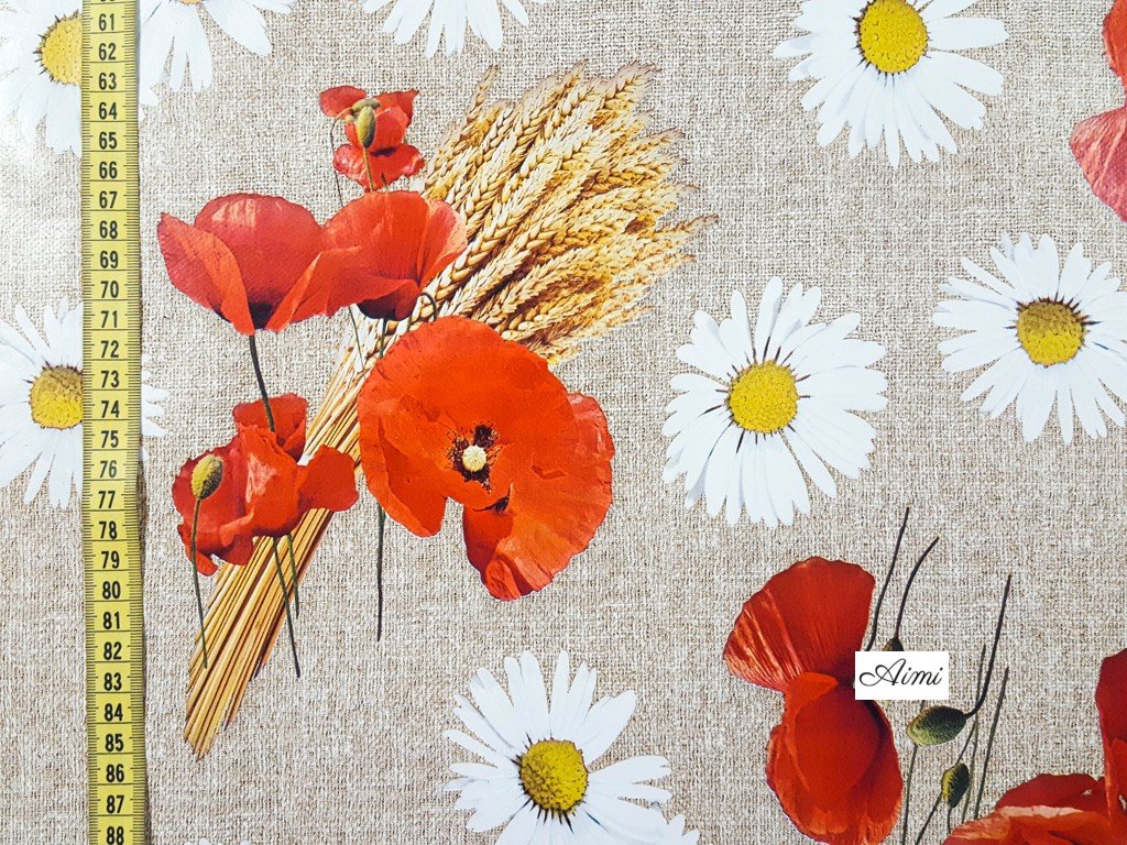 PVC gumený obrus okrúhly šírka 140cm priemer - Červené Maky Margarétky a Klasy