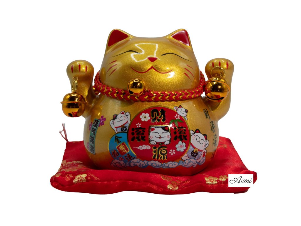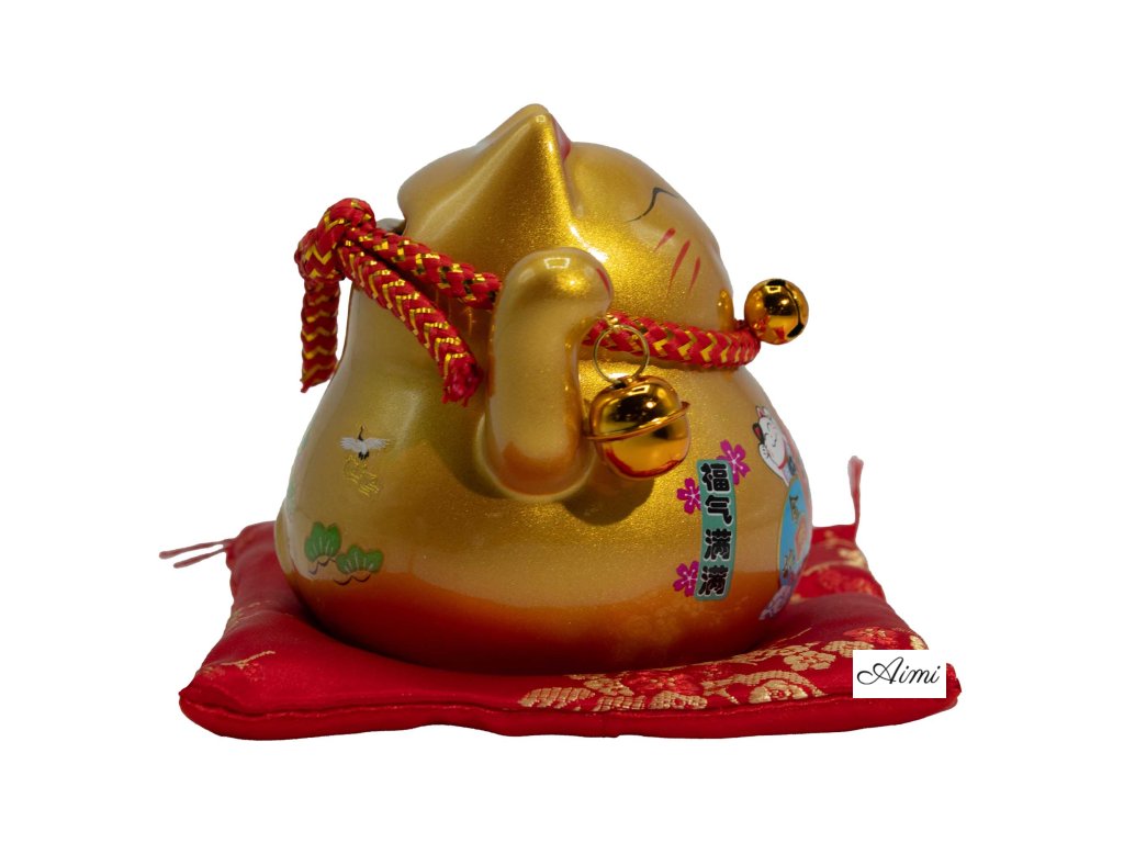 Keramická pokladnička v tvare mačičky šťastia – zlatá na vankúši spája dekoratívny charakter s praktickou funkciou pokladničky, vďaka čomu predstavuje prirodzený posun od bežných novelty produktov.