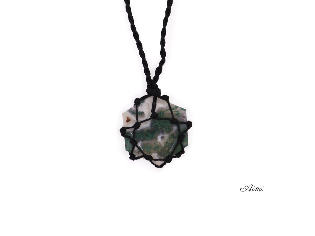 Tento drahokam je známy svojimi sviežimi zelenými a zemitými inklúziami. Verí sa, že spája svojho nositeľa s prírodou, zvyšuje duševnú jasnosť a podporuje osobný rast. Každý šesťuholníkový prívesok machového achátu je šnurovaný, čo umožňuje presvitať vzorom drahokamu.