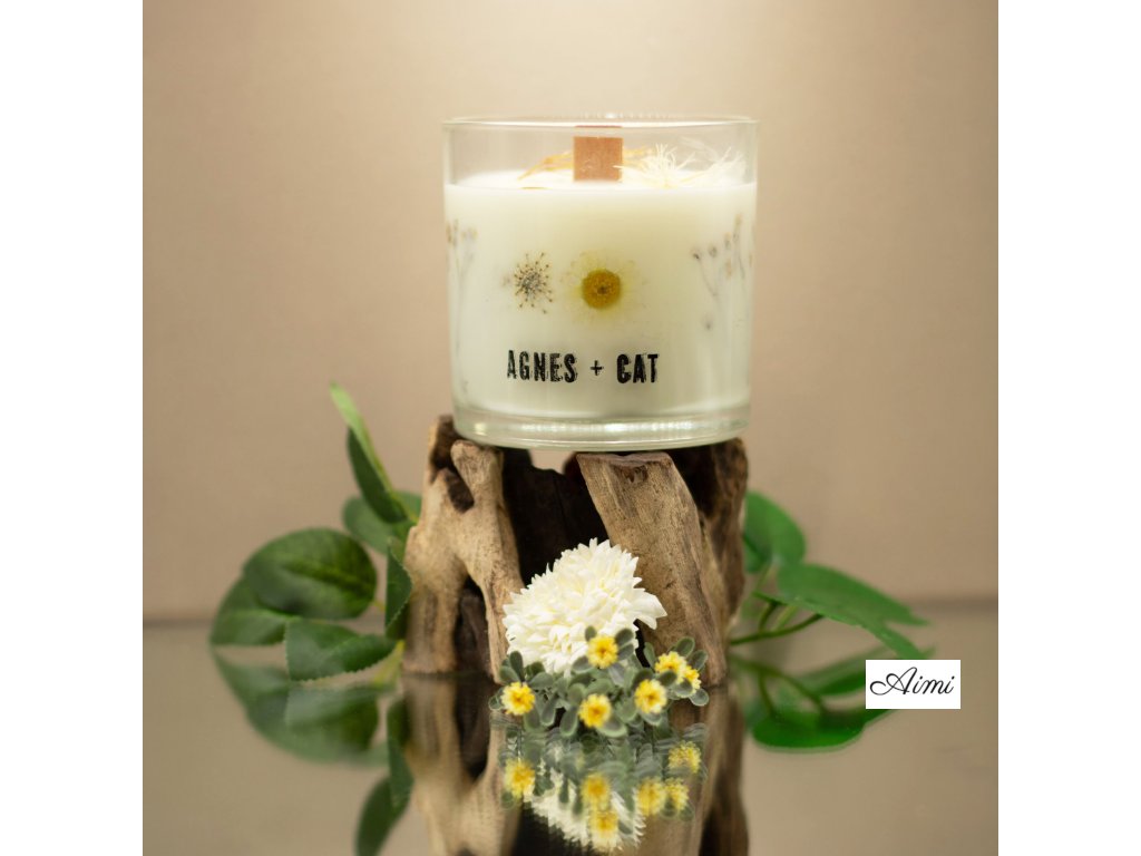 Sviečka je vyrobená z prírodného sójového vosku a poskytuje čisté, stabilné horenie vhodné na každodenné používanie. Sušené botanické prvky vsadené do vosku dodávajú nenápadný vizuálny detail, ktorý zachováva prirodzený a decentný charakter dizajnu. Priehľadný sklenený pohár spolu so značkovým balením vytvárajú upravený, súčasný vzhľad, ktorý sa dobre uplatní v rôznych typoch predajných prostredí.