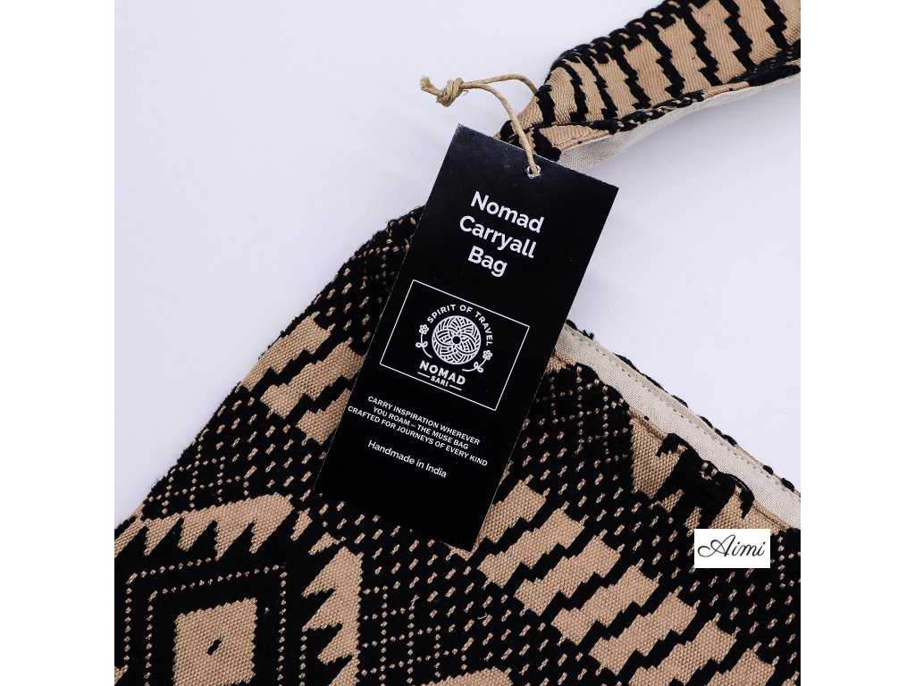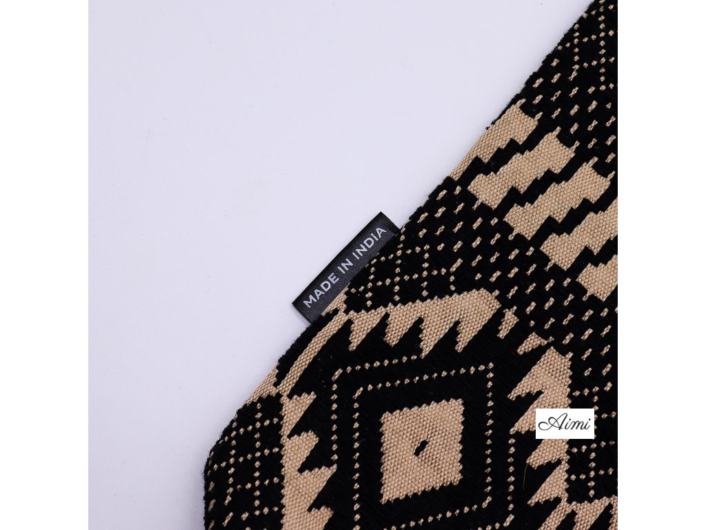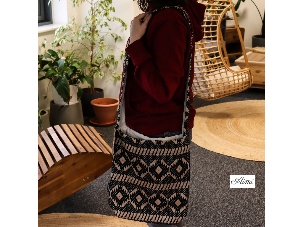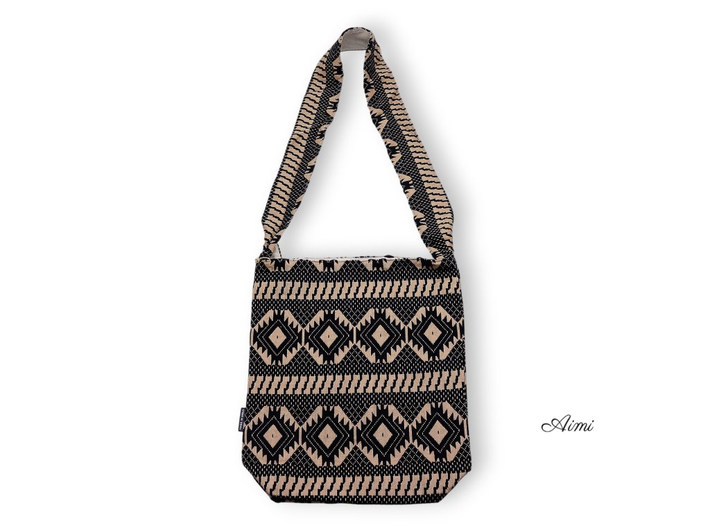 Púštny Tkáčsky Vzor – Nomádska Priestranná Taška spája výrazný dizajn s každodennou funkčnosťou. Nápadný geometrický žakárový vzor v čiernych a pieskových tónoch dodáva každému outfitu autentický remeselný akcent.