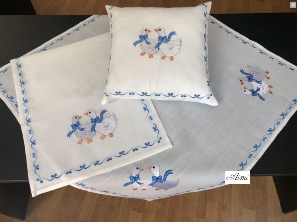Krásny Veľkonočný vyšívaný obrus, na bielom podklade je krásna Veľkonočná výšivka MODRÝCH HUSÍ. Vyskladajte si svoju súpravu z dostupných veľkostí a zútulnite si svoju domácnosť.