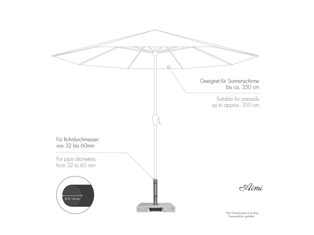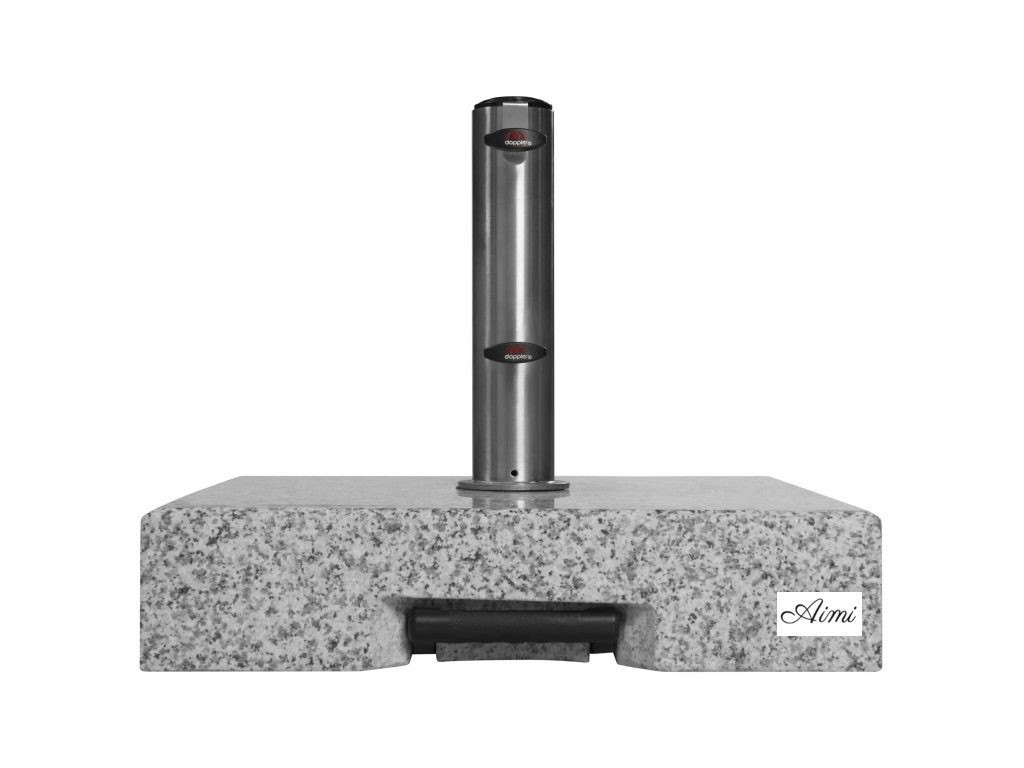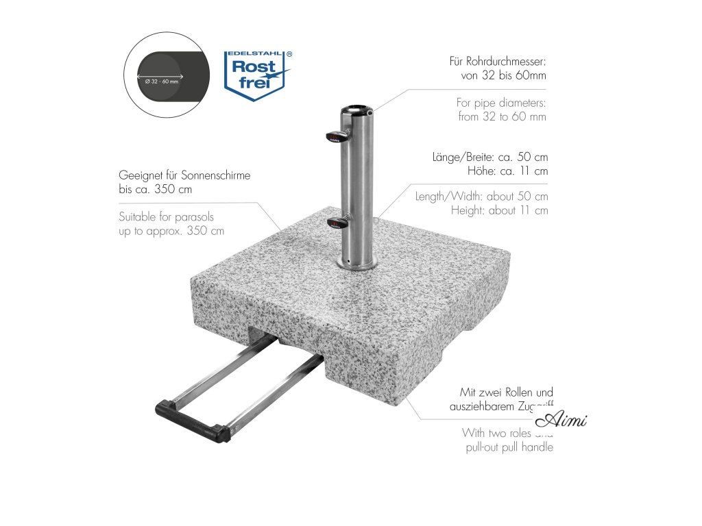 Žulový stojan TROLLEY 50 kg Vyrobený zo svetlo šedej žuly s 2 kolesami a rozšíriteľnou trolejovou rukoväťou pre ľahkú prepravu. Nerezová tyč má niekoľko redukčných krúžkov, ktoré umožňujú použitie slnečníkov s priemerom tyče 32-60 mm. Slnečník sa kotví do tyče (rúrka z nerezovej ocele) pomocou dvoch poistných skrutiek. Vďaka svojej hmotnosti 50 kg je zaistená bezpečná stabilita aj stredne veľkých stredových slnečníkov až do priemeru 350 cm. Žula je veľmi odolná voči poveternostným vplyvom a stojan je preto možné využívať celoročne. Zdôrazňujeme, že žula je prírodný materiál, takže štruktúra a farba sa môžu v priebehu času mierne meniť. Informácie o produkte: hmotnosť: 50 kg vhodný pre slnečníky až do 350 cm pre priemery tyče od 32 do 60 mm základňa: leštená žulová doska rúrka: nerezová oceľ, nerez výška stúpania: 30 cm 2 plastové kolesá a zaťahovateľná rukoväť k dispozícii sú redukčné krúžky vrátane 2 zaisťovacích skrutiek rozmery: cca 45 x 45 x 10 cm (dĺžka x šírka x výška) DÔLEŽITÉ: Žula je prírodný produkt. Odchýlky v štruktúre a farbe sú vyhradené.
