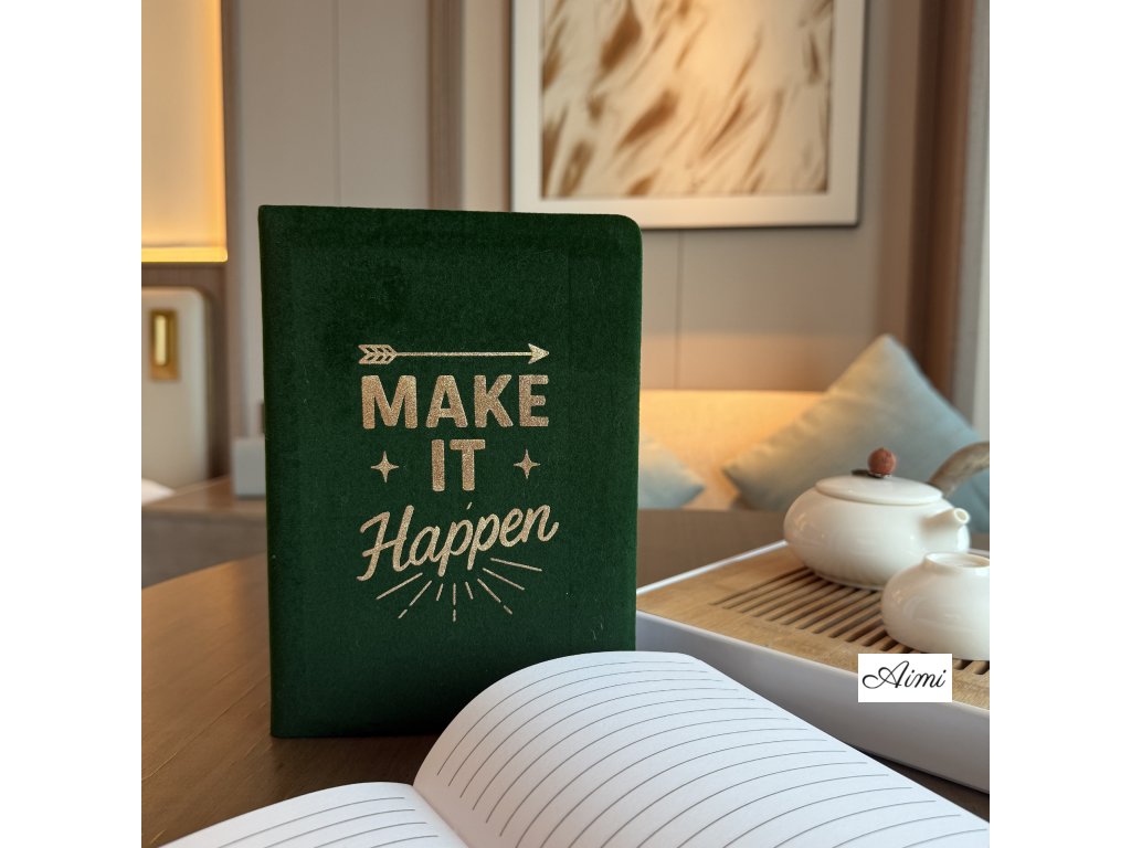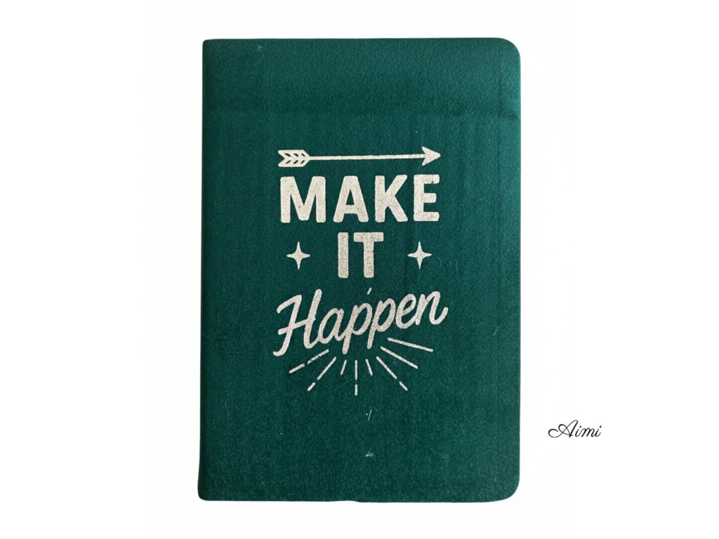 Obohaťte svoju kolekciu papiernictva o zápisník „Make It Happen“ v elegantnej tmavozelenej farbe. Mäkký zamatový obal s výrazným reliéfnym nápisom Make It Happen – „Urob to skutočným“ – motivuje k činom rovnako, ako slúži praktickému účelu.